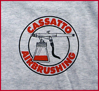 Cassatto Airbrushing silk screened T-shirts in gray or black with the Cassatto logo on the front and the motorcycle/body painting on the back. 100% cotton.