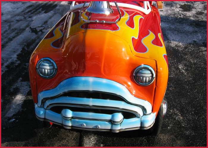 Steve Zoppolla, an automotive enthusiast, restored this toy up to painting it red. Then Cassatto and Steve came up with the additional details, which include the flame job, details on headlights and bumpers, and Williston Park Fire Department emblems.