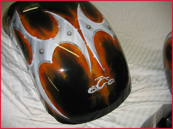 This is a paint job that was done for Orange County Choppers. Steel tribal with carriage bolts engulfed in fire.